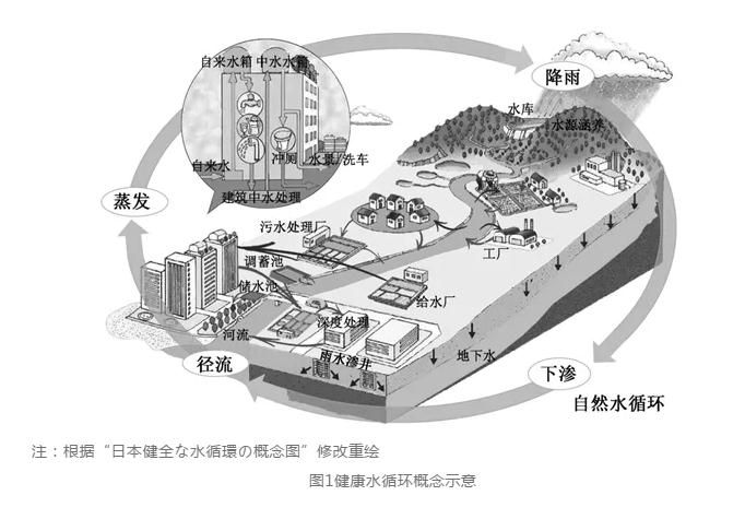 2014年至今,日本城市水系統(tǒng)進(jìn)入了體系優(yōu)化階段,這一階段最顯著的特點(diǎn)是健康水循環(huán)理念得到前所未有的重視,城市水系統(tǒng)工作從要素治理向系統(tǒng)綜合整治轉(zhuǎn)變。事實(shí)上,日本很早就開(kāi)始重視水循環(huán)的重要作用,2000年制定的《全國(guó)綜合水資源計(jì)劃》(又稱(chēng)“21世紀(jì)水計(jì)劃”)就提出了構(gòu)筑可持續(xù)的用水體系,適應(yīng)循環(huán)型社會(huì)發(fā)展的要求,但由于種種原因,這一理念在涉水工作發(fā)展進(jìn)程中并未被完全落實(shí)。隨著日本經(jīng)濟(jì)社會(huì)發(fā)展模式的轉(zhuǎn)變,人口老齡化和氣候變暖等多種因素的影響,加以城市水資源、水環(huán)境、水安全問(wèn)題仍舊凸顯,日本的城市規(guī)劃建設(shè)者開(kāi)始意識(shí)到城市水系統(tǒng)是城市復(fù)雜大系統(tǒng)的重要組成部分,涉及城市水資源開(kāi)發(fā)利用、水環(huán)境治理保護(hù)、水安全保障提升等全要素全過(guò)程,局部的涉水工作難以解決整體問(wèn)題,需要用系統(tǒng)的思維來(lái)認(rèn)識(shí)和分析面臨的水問(wèn)題,以城市為核心構(gòu)建健康水循環(huán)才能實(shí)現(xiàn)城市水系統(tǒng)對(duì)經(jīng)濟(jì)社會(huì)的永續(xù)支撐(見(jiàn)圖1)。