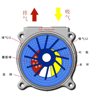 葉輪與泵殼成偏心,泵殼內(nèi)充一定量的水,葉輪旋轉(zhuǎn)使水形成水環(huán)。相鄰葉片(如圖中紅色葉片)旋轉(zhuǎn)時(shí),與水環(huán)形成的空間(氣室)變大即進(jìn)氣,空氣(氣室)逐漸變小,即空氣被壓縮。多組相鄰葉片,即多組往復(fù)壓縮。結(jié)構(gòu)緊湊、工作平衡可靠和流量均勻,所以化工生產(chǎn)中多用來輸送或抽吸易燃、易爆和有腐蝕性的氣體。水環(huán)式真空泵由于葉輪攪拌液體,損失能量大,故其效率很低。