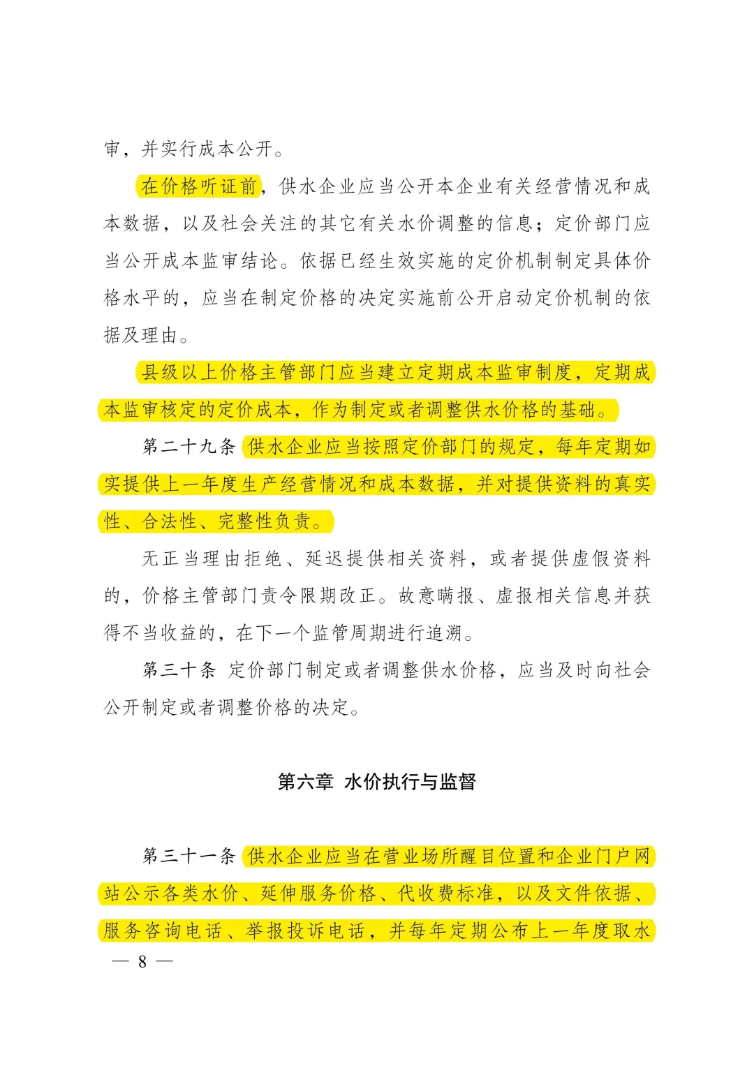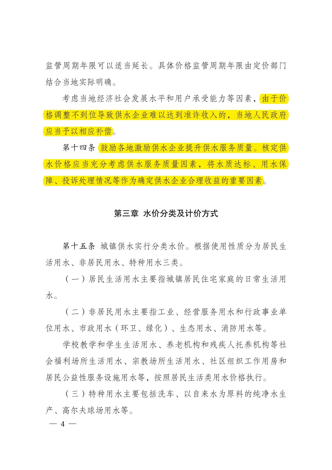 四是建立了供水價格定期校核機制和補償機制。明確城鎮供水價格監管周期原則上為3年,建立供水價格與原水價格等上下游聯動機制的,監管周期年限可以適當延長。考慮當地經濟社會發展水平和用戶承受能力等因素,由于價格調整不到位導致供水企業難以達到準許收入的,當地人民政府應當予以相應補償。