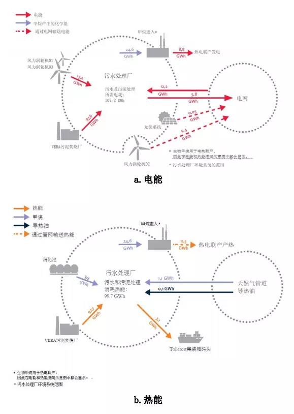 k?hlbrandh?ft/dradenau污水處理廠對剩余污泥進行厭氧消化,同時收集廠外生物廢棄物與污泥共消化以增加沼氣產量,并實現沼氣轉換為天然氣對外輸送。后續消化熟污泥施以焚燒處置,進一步熱電聯產回收電能和熱能;電能彌補自身電耗使用,熱能則被輸送至污泥干化設備,可完全滿足高溫干化需要;污泥干化后的低溫余熱可繼續供消化池保溫使用。如此設計,可實現電能與熱能高效回收利用。此外,自2009年起該廠富余熱能還向附近碼頭輸出供應。圖3為該廠2018年電能與熱能流向示意圖。該廠污泥焚燒產能遠遠大于沼氣熱電聯產,且應用太陽能、風能等清潔能源,實現能源回收的同時進一步減少co2排放。2018年該廠總電耗為107.2 gw·h/a,產電量為115 gw·h/a,電能自給率達107%;總熱耗為99.7 gw·h/a,產熱量為113 gw·h/a,熱能自給率達113%。可見,該廠通過自身進水中高濃度有機物(cod=850 mg/l)、外源有機廢棄物、太陽能、風能等綜合利用,已超越能源中和目標并可向外供氣(ch4)和熱。預計未來該廠將達到發電量大于耗電量的30%,熱能供應范圍也將進一步擴大。