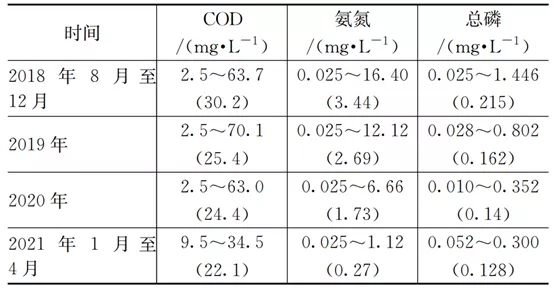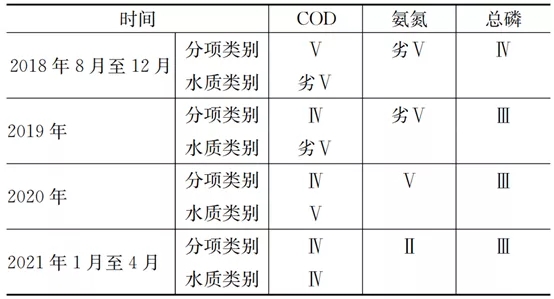 練江流域新一輪的整治工作重點(diǎn)中,加強(qiáng)污水處理產(chǎn)及配套管網(wǎng)的建設(shè)以擴(kuò)大污水收集能力及處理能力,配合河道清理、清淤及垃圾處置,流域水質(zhì)不斷改善。海門灣橋閘斷面2018年至2021年的水質(zhì)監(jiān)測數(shù)據(jù)見表1和表2。