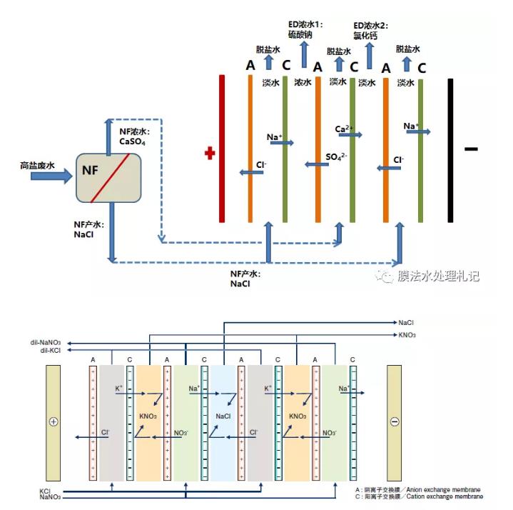nf-ed的聯(lián)用工藝可以算一個思路,工藝可行性沒有問題,它其實是置換電滲析(第二張圖)的延伸應(yīng)用。這種工藝在廢水處理需求中落地性會受限于多種因素,如廢水組成、濃水溶液的純度、脫鹽水的處理等。