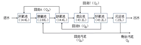 小試裝置為變形uct工藝,由有機(jī)玻璃材質(zhì)制成,長(zhǎng)×寬×高為1.44 m×0.3 m×0.3 m,有效容積為120 l,通過(guò)擋板分為5個(gè)反應(yīng)區(qū)。小試裝置反應(yīng)區(qū)構(gòu)成及其體積如圖1所示。每個(gè)反應(yīng)池設(shè)有攪拌器,在混合池及好氧池底部各均勻布置6個(gè)曝氣頭。好氧池末端連接23 l柱狀沉淀池,設(shè)計(jì)表面負(fù)荷為0.64 m3/(m2·h)。為避免藻類(lèi)滋生對(duì)試驗(yàn)產(chǎn)生影響,整個(gè)反應(yīng)器池體用黑色遮光布進(jìn)行遮光處理。