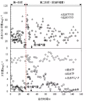 2.1 纖維素對(duì)cod與p去除的影響圖2顯示了小試裝置在整個(gè)試驗(yàn)期間出水cod與磷濃度變化。在第一階段進(jìn)水tcod濃度維持在450 mg/l時(shí),出水tcod平均為(39.7±16.1)mg/l,其中scod為(24.8±10.8) mg/l,符合國(guó)家一級(jí)a排放標(biāo)準(zhǔn)。然而,當(dāng)?shù)诙A段加入纖維素后,cod去除效果明顯惡化,出水tcod最高檢測(cè)值高達(dá)95 mg/l(scod為80 mg/l)。為探究加入纖維素后cod去除效果惡化原因,對(duì)出水tcod的構(gòu)成進(jìn)行了分析。結(jié)果顯示,加入纖維素后出水ss顯著下降,從(48.25±3.29) mg/l降至(21.34±9.71) mg/l,由此可排除污泥沉降性能惡化導(dǎo)致出水cod升高問(wèn)題。纖維素富含官能團(tuán)且呈線狀,因此其對(duì)污泥具有較好網(wǎng)捕卷掃作用,可促進(jìn)污泥絮體凝結(jié)并提高其緊密度,這一現(xiàn)象通過(guò)污泥鏡檢也得到了印證。然而,不論是因纖維素自身作為cod消耗氧氣,還是導(dǎo)致污泥絮體變得緊密都有可能降低氧傳質(zhì),從而弱化了對(duì)cod的降解效率。為此,在第46 天對(duì)好氧池運(yùn)行進(jìn)行調(diào)整,將曝氣量提高至0.30~0.50 l/min(添加纖維素前為0.10~0.20 l/min)。結(jié)果,出水cod開(kāi)始逐漸下降并恢復(fù)至投加纖維素前水平(tcod=49.4 mg/l,scod=34.2 mg/l)。可見(jiàn),回收纖維素對(duì)曝氣池運(yùn)行有著積極影響,可提高氧氣傳質(zhì)與利用效率。