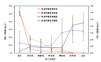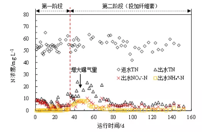 與此同時(shí),纖維素投加對(duì)磷去除的影響與cod類(lèi)似,在纖維素投加初期(第36~50 天),出水總磷(tp)和正磷酸鹽(po3-4-p)濃度均開(kāi)始惡化,去除率分別降低至51.99%和56.32%。從發(fā)生原因來(lái)看,do不足是導(dǎo)致磷去除效率下降的主因,可以從增大曝氣量后出水tp逐漸下降得到驗(yàn)證。然而,出水tp含量在提高曝氣量后的很長(zhǎng)一段時(shí)間內(nèi)也沒(méi)有恢復(fù)至投加纖維素前水平,而是保持在(2.86±1.22) mg/l左右。為進(jìn)一步分析其原因,在第68 天從曝氣池末端取混合樣進(jìn)行了聚磷菌(paos)活性測(cè)定,并與投加纖維素前的活性進(jìn)行了對(duì)比。結(jié)果顯示,投加纖維素后,反應(yīng)器中paos比釋磷速率和比吸磷速率分別為11.3 和12.0mg/(gvss?h),與投加前的10.8 、13.4 mg/(gvss?h)相比變化并不是很大。可見(jiàn),纖維素的投加對(duì)paos活性的影響并不大。因此,反應(yīng)器除磷效果恢復(fù)較慢的原因可能與纖維素投加初期導(dǎo)致的跑泥和生物量恢復(fù)較慢有關(guān)。2.2 纖維素對(duì)氮去除的影響圖3顯示了在投加纖維素前后裝置對(duì)氮去除效果的變化。從整體上看,反應(yīng)器無(wú)論是否投加纖維素均能夠很好地完成脫氮,投加前出水tn、nh4+-n和 no3--n平均濃度分別(5.9±3.1)、(0.40±0.96)(4.59±2.22)mg/l,投加后為(7.80±5.46)、(1.30±2.00)、(4.11±2.22) mg/l。只是在纖維素投加初期,出水tn出現(xiàn)明顯惡化,此時(shí)出水中nh4+-n明顯增多,這顯然與上述氧傳質(zhì)受限有關(guān)。圖3顯示,在增大曝氣量后對(duì)tn的去除效率迅速恢復(fù),主要是因?yàn)橄趸芰﹂_(kāi)始恢復(fù)。