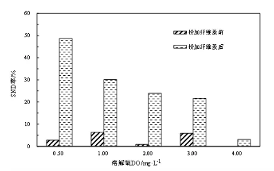 投加纖維素前后的snd效率見(jiàn)圖5,第一階段(未投加纖維素)無(wú)論do濃度多大,snd效率均不高(<8%);即使控制do在0.5 mg/l時(shí),snd效率也不過(guò)2.8%。相反,第二階段添加纖維素后,snd效率明顯提高,do=0.5 mg/l時(shí)達(dá)48.69%;即使do提高至3 mg/l,snd效率依然可以保持在20%。這一結(jié)果深入揭示了纖維素對(duì)絮體致密性產(chǎn)生的絮體內(nèi)do梯度之重要作用。