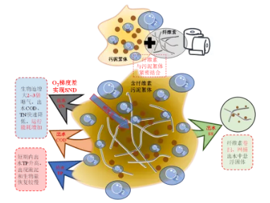 2.3 纖維素對(duì)運(yùn)行的影響纖維素對(duì)反應(yīng)器運(yùn)行影響是兩方面的,似乎均與其對(duì)污泥絮體致密程度有關(guān)。圖6總結(jié)了纖維素對(duì)反應(yīng)器運(yùn)行、能耗等方面的影響及其機(jī)理。纖維素通過(guò)自身線狀形態(tài)和官能團(tuán)可靠網(wǎng)捕卷掃作用將污泥絮體密實(shí)包裹,相當(dāng)于促進(jìn)絮凝,可降低出水ss以及其中所含n、p。