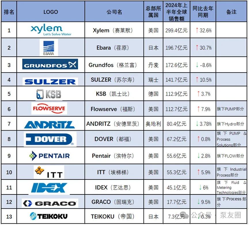 隨著2024年半年報的陸續發布,根據統計,納入匯總的13家國際知名泵企,其上半年總銷售額達到約1264.6億元人民幣,相較于去年同期的1051.74億元,總體實現了20.2%的同比增長。在這13家企業中,尤為值得關注的是,僅有3家企業實現了兩位數以上的強勁增長,共有7家企業實現了與去年同比有增幅。