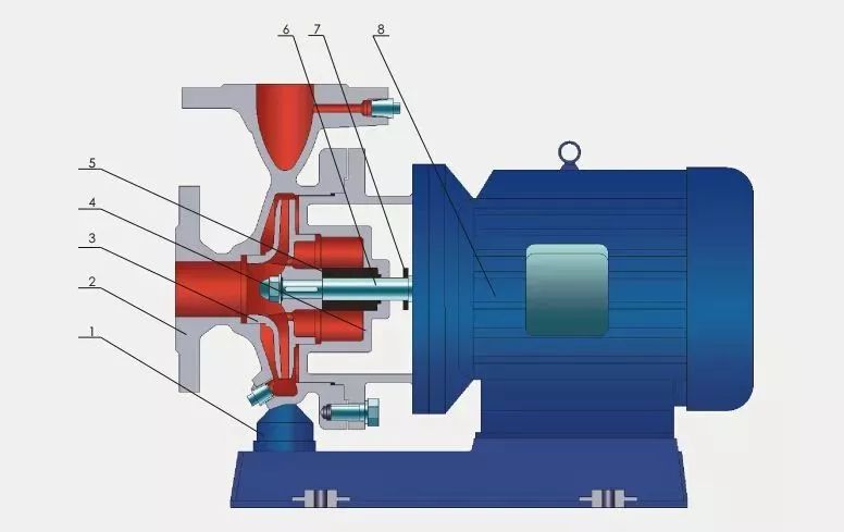 在泵啟動(dòng)前,泵殼內(nèi)灌滿被輸送的液體;啟動(dòng)后,葉輪由軸帶動(dòng)高速轉(zhuǎn)動(dòng),葉片間的液體也必須隨著轉(zhuǎn)動(dòng)。在離心力的作用下,液體從葉輪中心被拋向外緣并獲得能量,以高速離開葉輪外緣進(jìn)入蝸形泵殼。